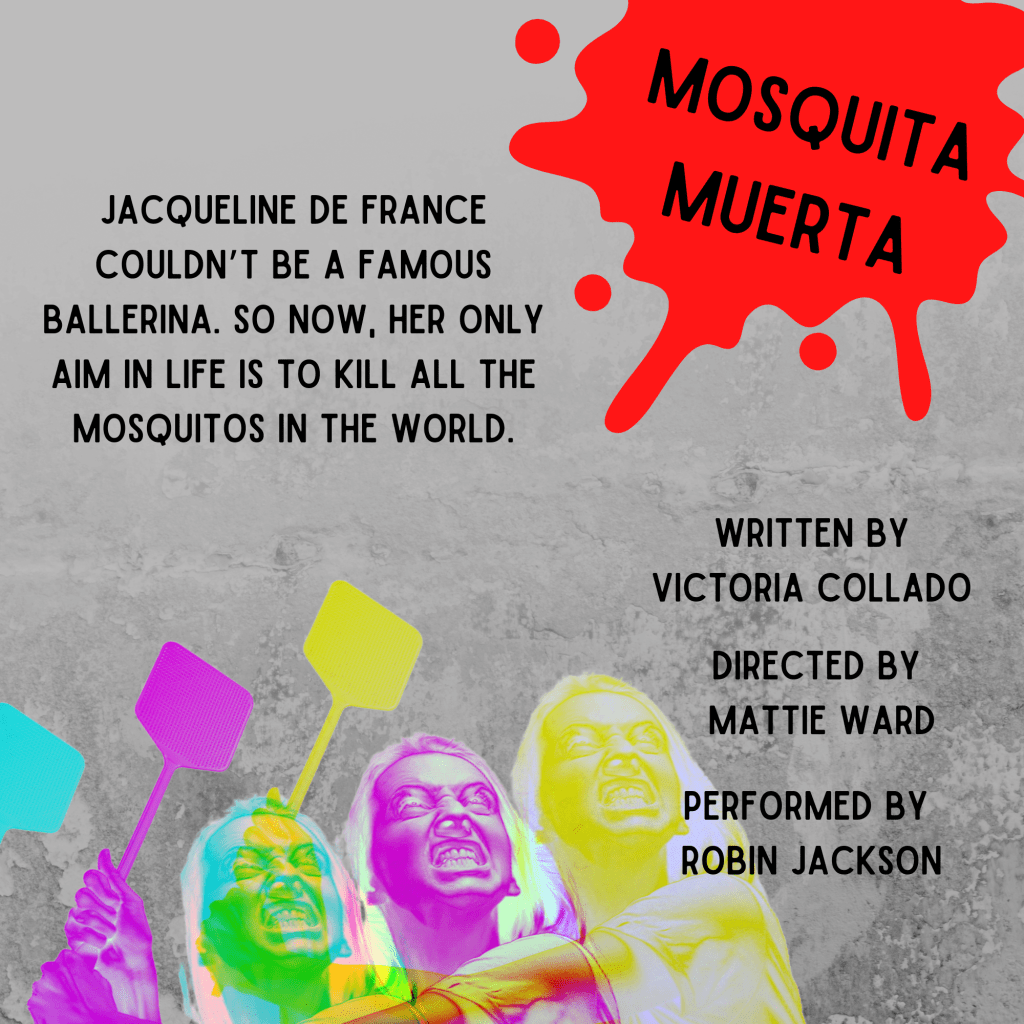 Mosquita muerta (The Dead Mosquito) was written by Victoria Collado, a young Cuban-American artist who lives in Miami. This play was presented in Spanish as part of Microteatro Miami. Mosquita muerta is a riotous physical comedy that tells the story of Jacqueline de France, a woman whose dreams of becoming a famous ballerina were cut short by a pesky mosquito. She now dedicates her life to killing all the mosquitos in the world. The play is directed by Mattie Ward and performed by Robin Jackson.