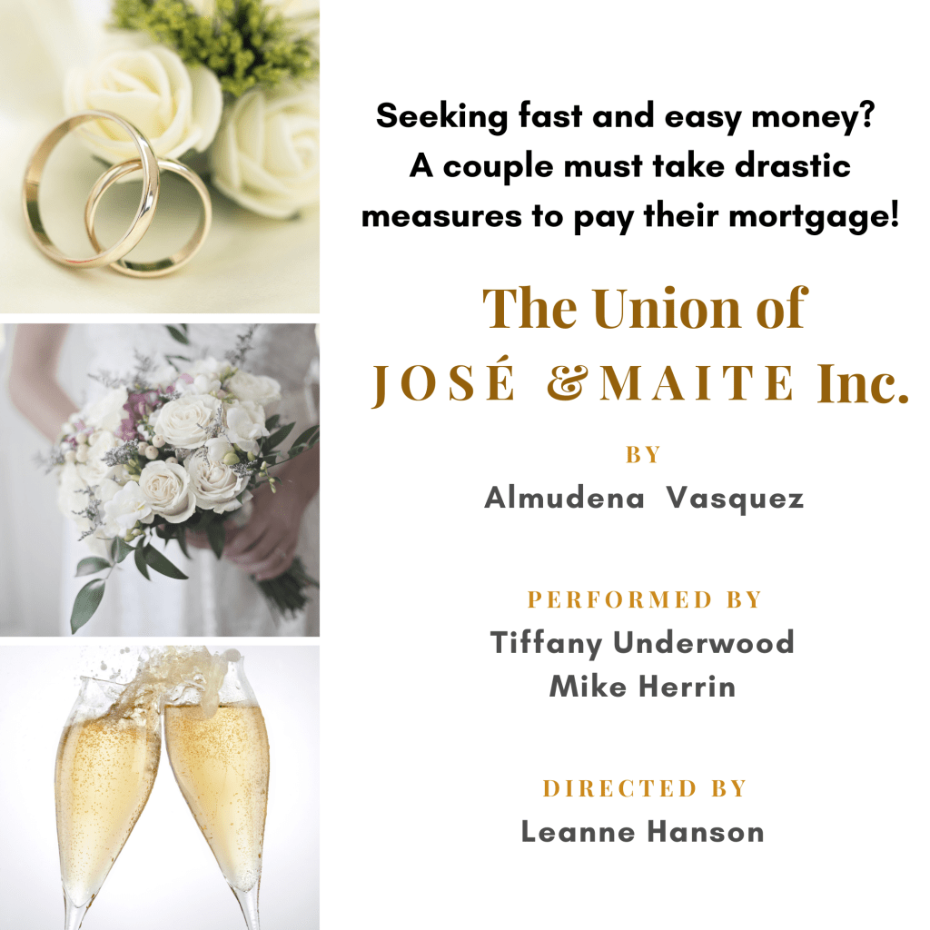 The Union of Maite and Jose, Inc. was written by Almudena Vazquez, a Spanish playwright, screenwriter, and director. In this clever comedy, Maite and Jose, a broke couple with no money to pay their mortgage, come up with the perfect plan to end their financial distress: a wedding! This play is directed by Leanne Hanson and performed by Mike Herrin and Tiffany Underwood. This is the first time the play has been performed in English with a translation by Alejandra Gutierrez.